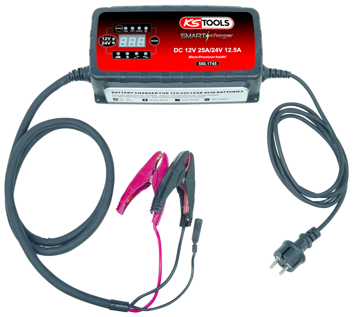 „Gerade jetzt im Winter ist ein gutes Ladegerät unerlässlich“, erklärt das Produktmanagement bei KS Tools. „Denn bei der kalten Witterung sind Batterieausfälle an der Tagesordnung.“ Die präzise Ladesteuerung erledigt ein Mikroprozessor, der auch die Überladung verhindert. Er schaltet automatisch in den Erhaltungsmodus um, sobald die Batterie vollständig geladen ist. Weiterhin erkennt das Gerät automatisch eine tief entladene und /oder sulfatierte Batterie und startet automatisch ein Reparaturprogramm.