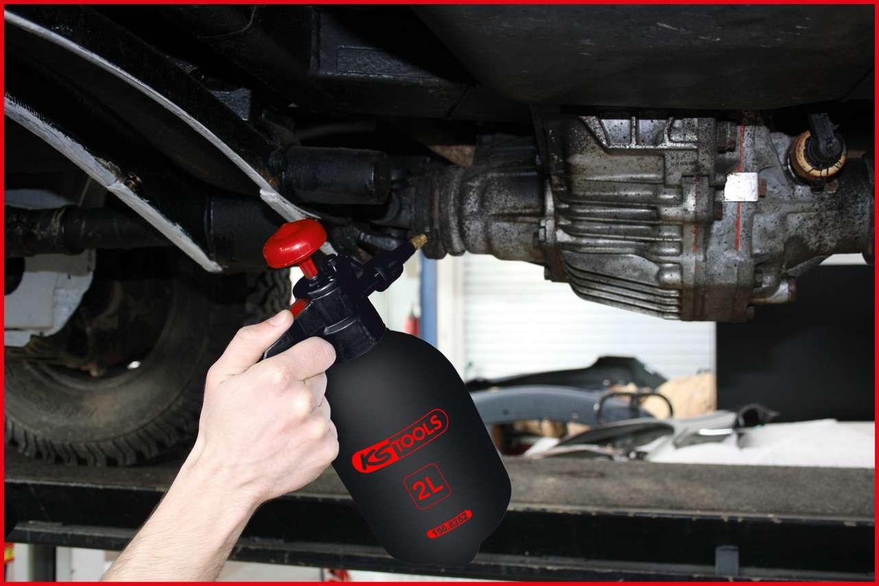 Der Druck-Zerstäuber von KS Tools ist nicht nur perfekt für schwer zugängliche Stellen geeignet, sondern baut auch beim Arbeiten über Kopf genügend Druck auf. So können Werkstatt-Profis auch unter dem Fahrzeug oder von schräg unten zum Beispiel Bremsenreiniger oder andere Chemikalien sicher dort aufbringen, wo sie benötigt werden.