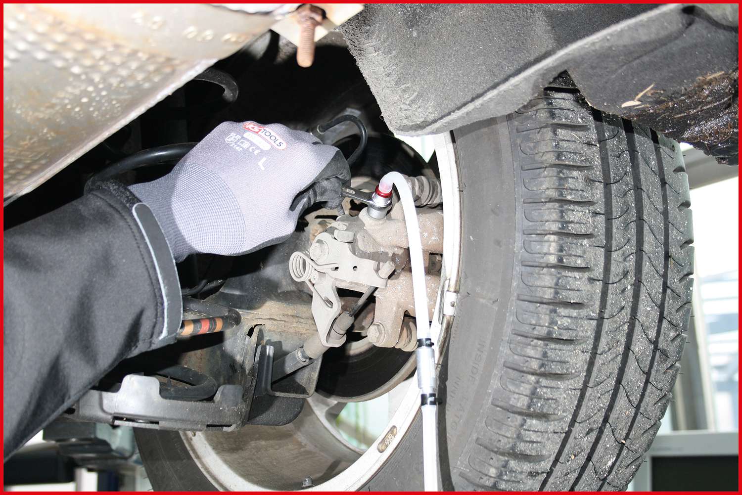 Das Entlüften der Bremsen ist meistens eine fummelige Angelegenheit. Die Entlüftungsnippel sitzen versteckt an schwer zugänglichen Stellen. Dazu kommt, dass die ätzende Bremsflüssigkeit im entscheidenden Moment gern einmal dorthin läuft, wo man sie nicht haben möchte. Genau für diese beiden Probleme ist der Bremsen-Entlüftungs- Schlüssel-Satz von KS Tools gedacht. Denn die handlichen Schlüssel sind mit ihren extra kurzen Zwölfkant-Stecknüssen so gebaut, dass sie nahezu überall einsetzbar sind. Der Silikon-Entlüfterschlauch bleibt beim Lösen und Festziehen auf dem Entlüfternippel stecken. Er hat außerdem ein Rückschlagventil, das den Rückfluss alter Bremsflüssigkeit sowie ausgepumpter Luft wirksam verhindert.