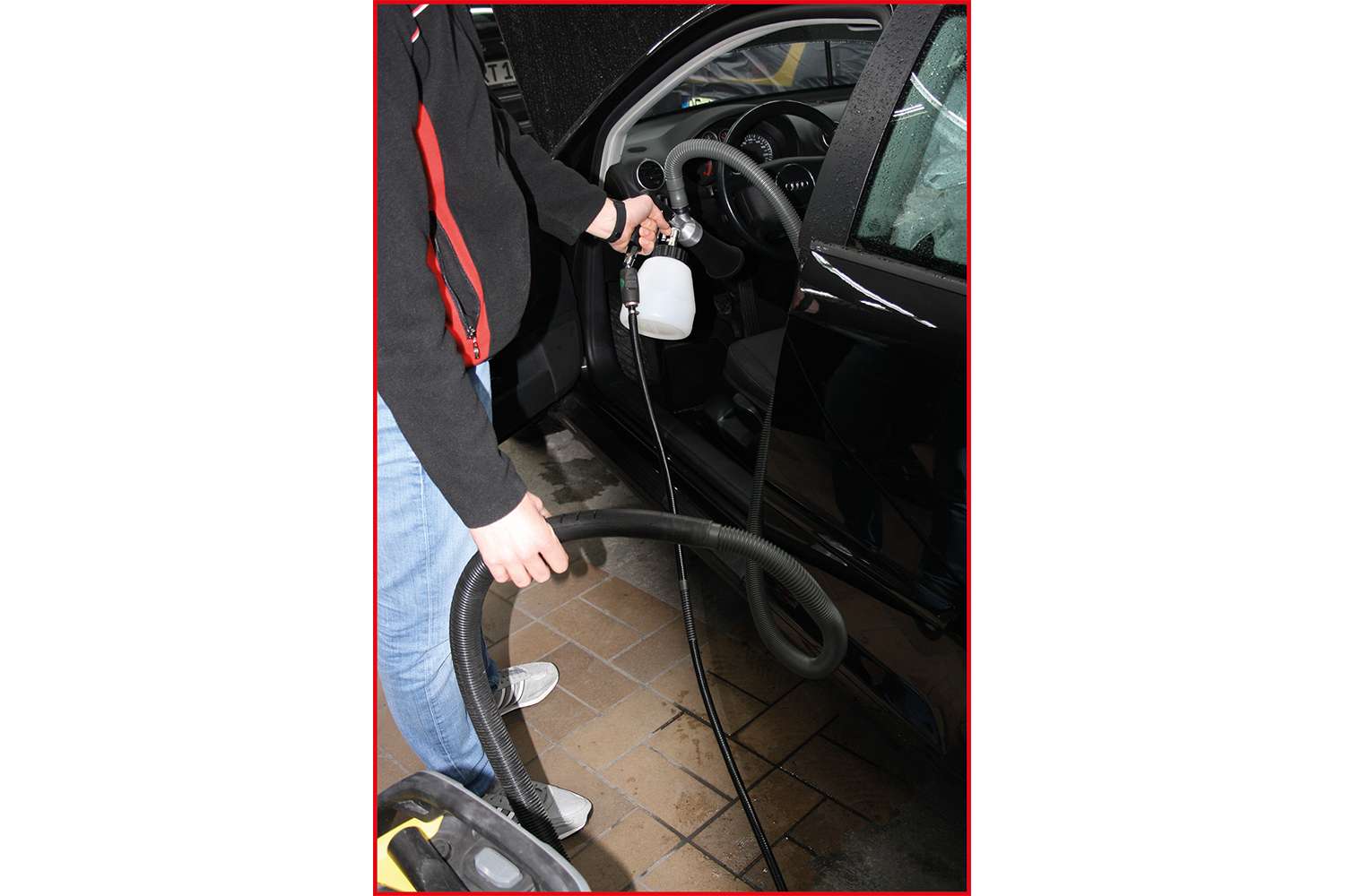 „Wer mit einer klassischen Reinigungspistole arbeitet, weiß, dass das eine staubige Angelegenheit ist,“ weiß man bei KS Tools. „Zwar wird der Staub durch die gleichzeitig aufgebrachte Reinigungsflüssigkeit gebunden, aber das verhindert das Aufwirbeln nur teilweise.“ Mit einem angeschlossenen Staubsauger dagegen fängt der professionelle Kfz-Aufbereiter den Staub dann auf, wenn es nötig ist: direkt während der Arbeit. Und die wird dadurch natürlich effizienter, denn der zusätzliche Arbeitsgang Staubsaugen entfällt. Dass dadurch auch eine Maske überflüssig ist, macht das Arbeiten noch einmal angenehmer.