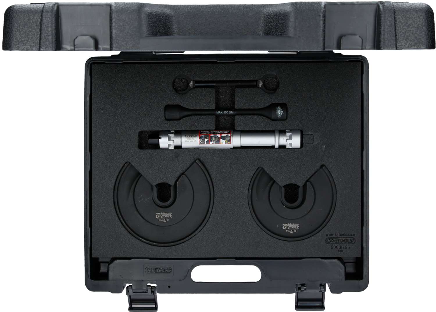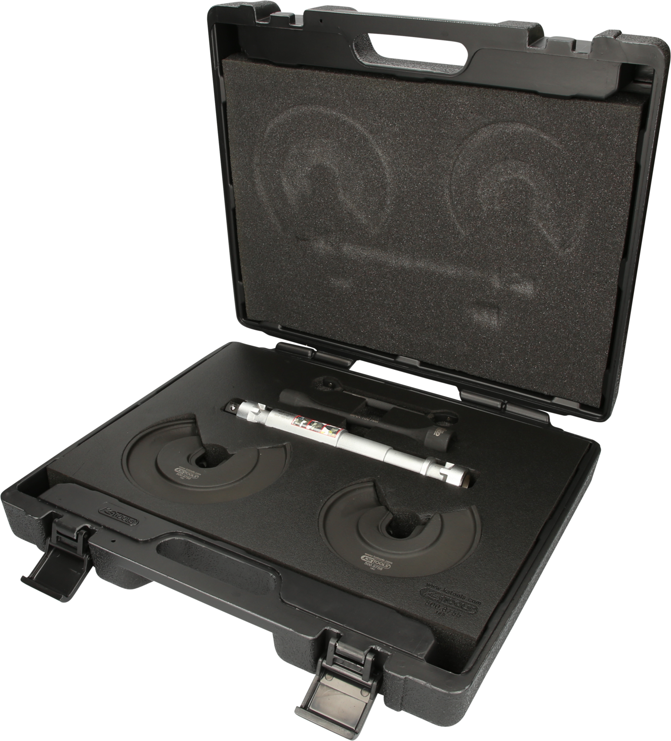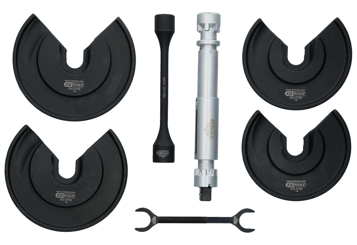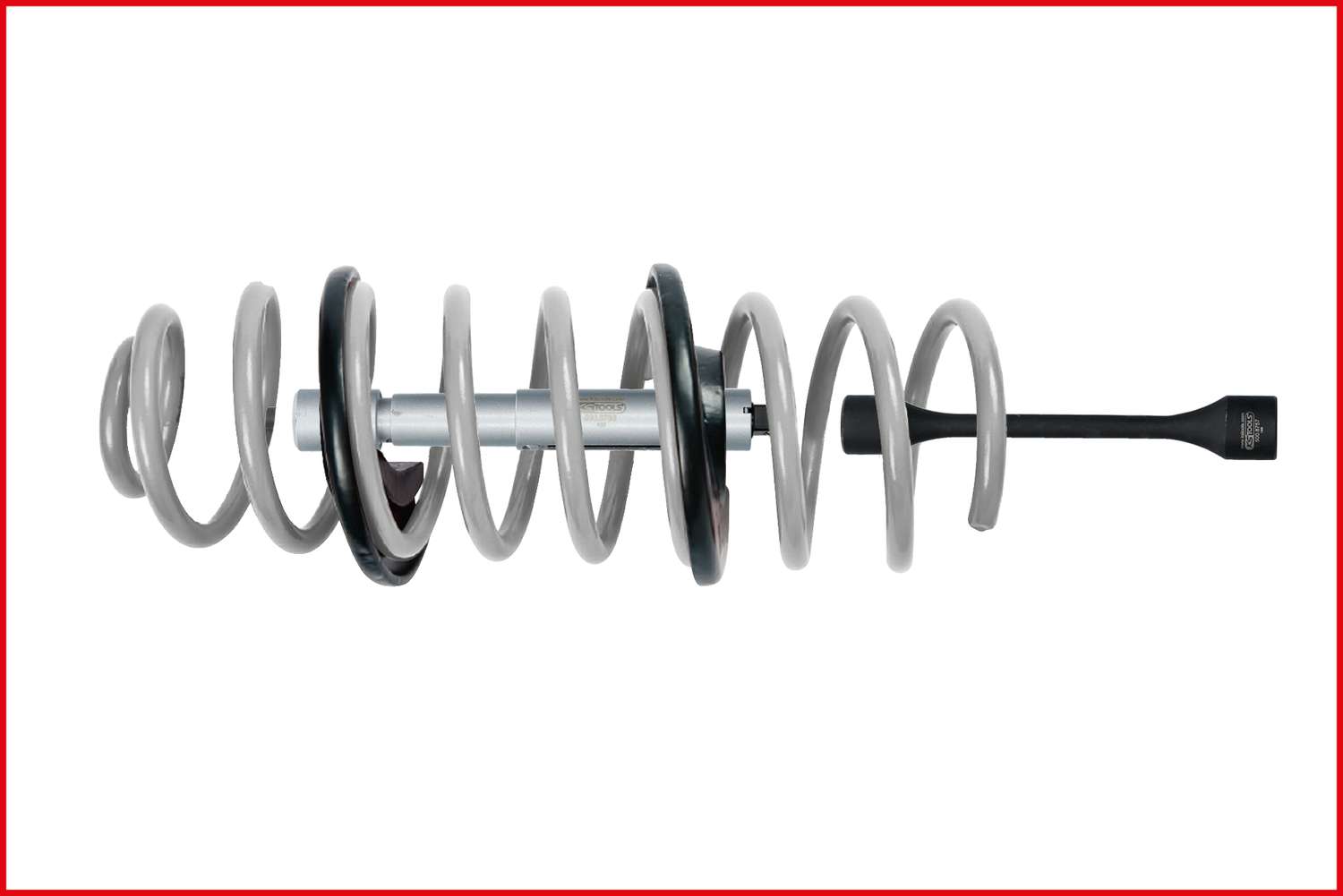 Ein Federwechsel an der Hinterachse ist meist ein aufwändiges Unterfangen. Denn häufig muss der Mechaniker zunächst die Achse unterbauen, zerlegen und ablassen. Das ist zeitaufwändig und nicht ganz ungefährlich, da die Feder vorgespannt im Achskörper sitzt. Mit dem neuen Federspanner von KS Tools gelingt der Federwechsel besonders schnell und ohne Risiko. Denn bei seinem Einsatz kann die Achse an Ort und Stelle bleiben. Sicher wird der Wechsel, weil dieses Werkzeug beim Spannvorgang das Verdrehen, Abkippen und Herausspringen der Federteller aus dem Federspanner Grundgerät verhindert. Die Produktnummer bei KS Tools ist 500.8755.