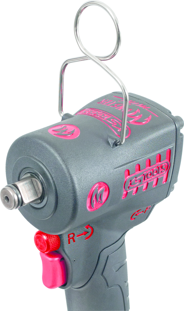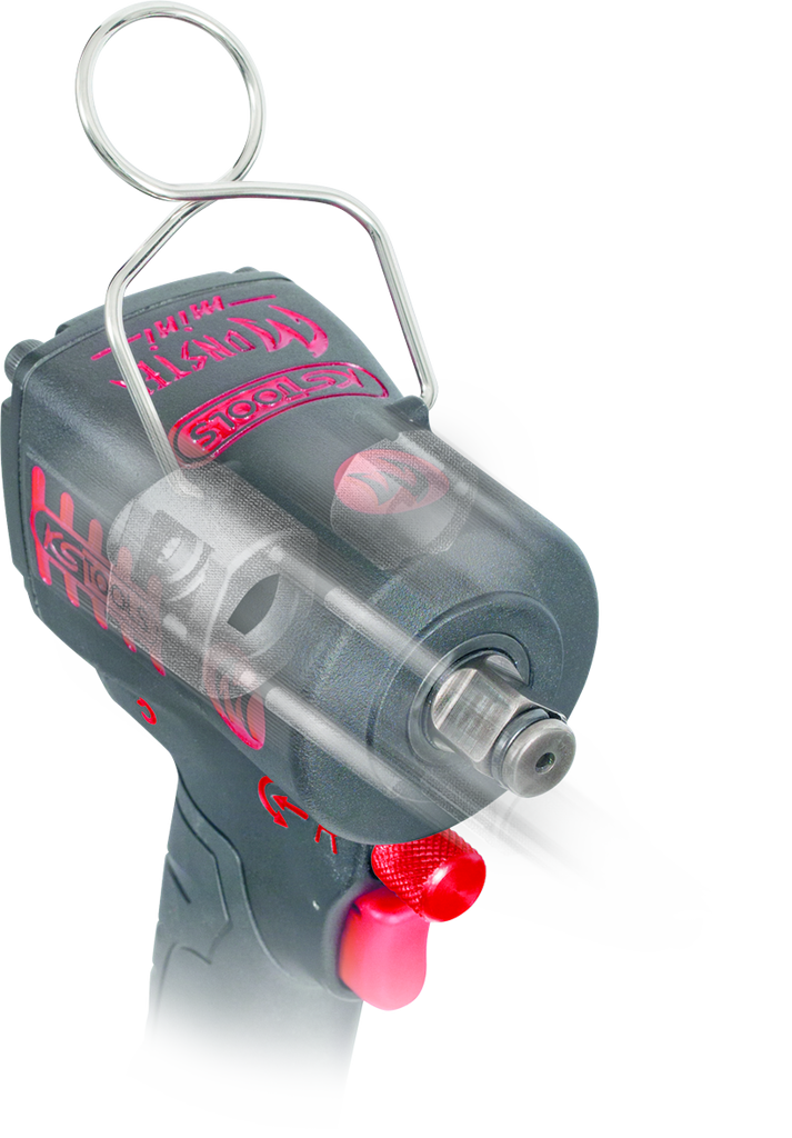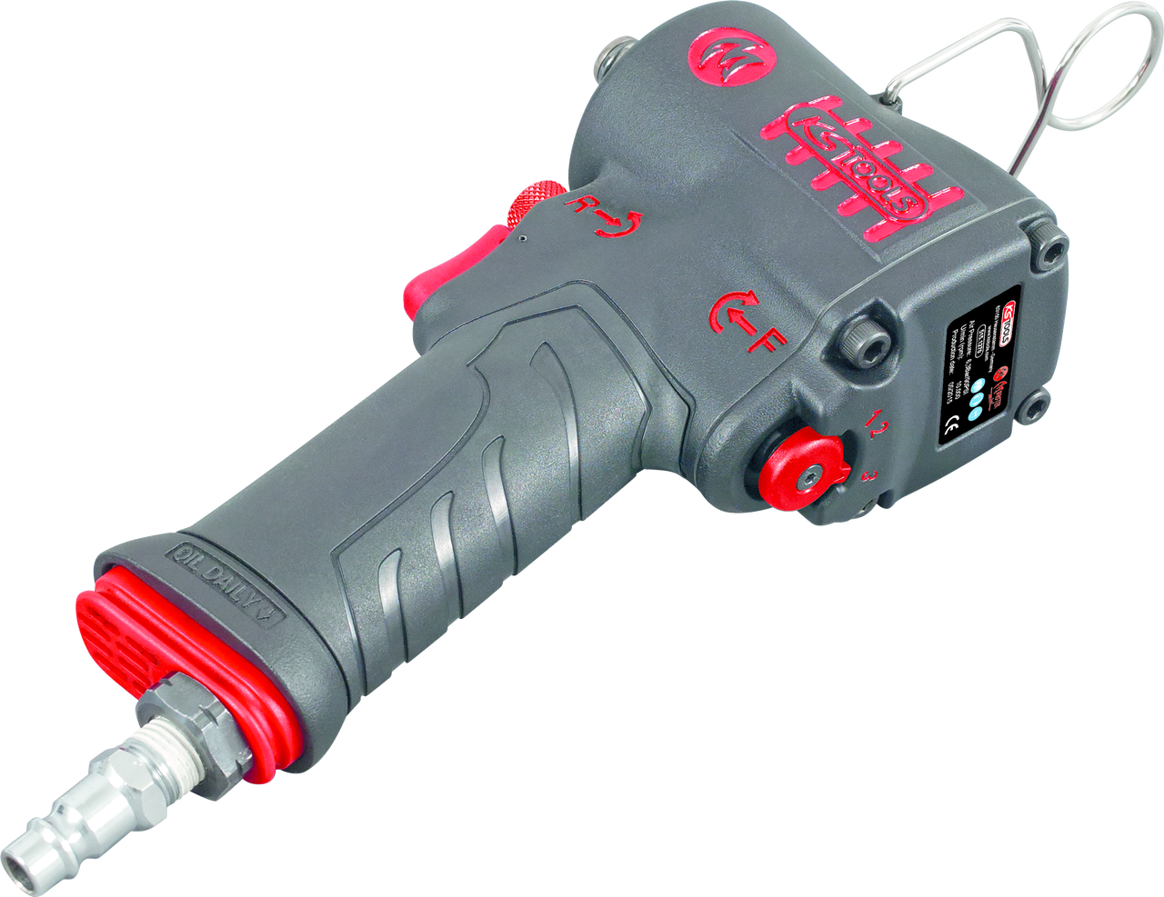 Ein weiterer wichtiger Punkt ist sein geringes Gewicht. Mit seinen knapp 1,3 Kilogramm liegt dieses Gerät nicht nur gut in der Hand, sondern sorgt auch für ein ermüdungsfreies Arbeiten. Eine technische Neuerung ist der Umsteuer-Schieber mit Doppelfunktion. Mit ihm lassen sich bequem die Drehrichtung Links- und Rechtslauf sowie eine dreifach Drehmoment-Vorwahl für beide Drehrichtungen einstellen. Das zuverlässig arbeitende Jumbo-Hammer-Schlagwerk sorgt für ein Lösemoment von 1390Nm, welches unter den Mini-Geräten im Markt seinesgleichen sucht. Das ist umso erstaunlicher, als das Eckmaß des kleinen Monsters nur 95 Millimeter beträgt. Damit löst das Mini-Monster nicht nur zuverlässig Räder, sondern lässt sich auch dort einsetzen, wo herkömmliche Halbzoll-Schlagschrauber aufgrund ungünstiger Platzverhältnisse nicht eingesetzt werden können. Weiterhin besitzt das Gerät eine Aufnahme zur optionalen Nachrüstung eines Abluftschlauches und einen abnehmbaren Aufhängebügel.