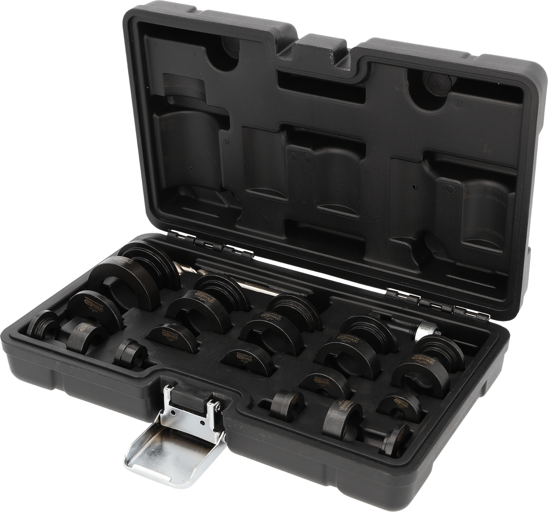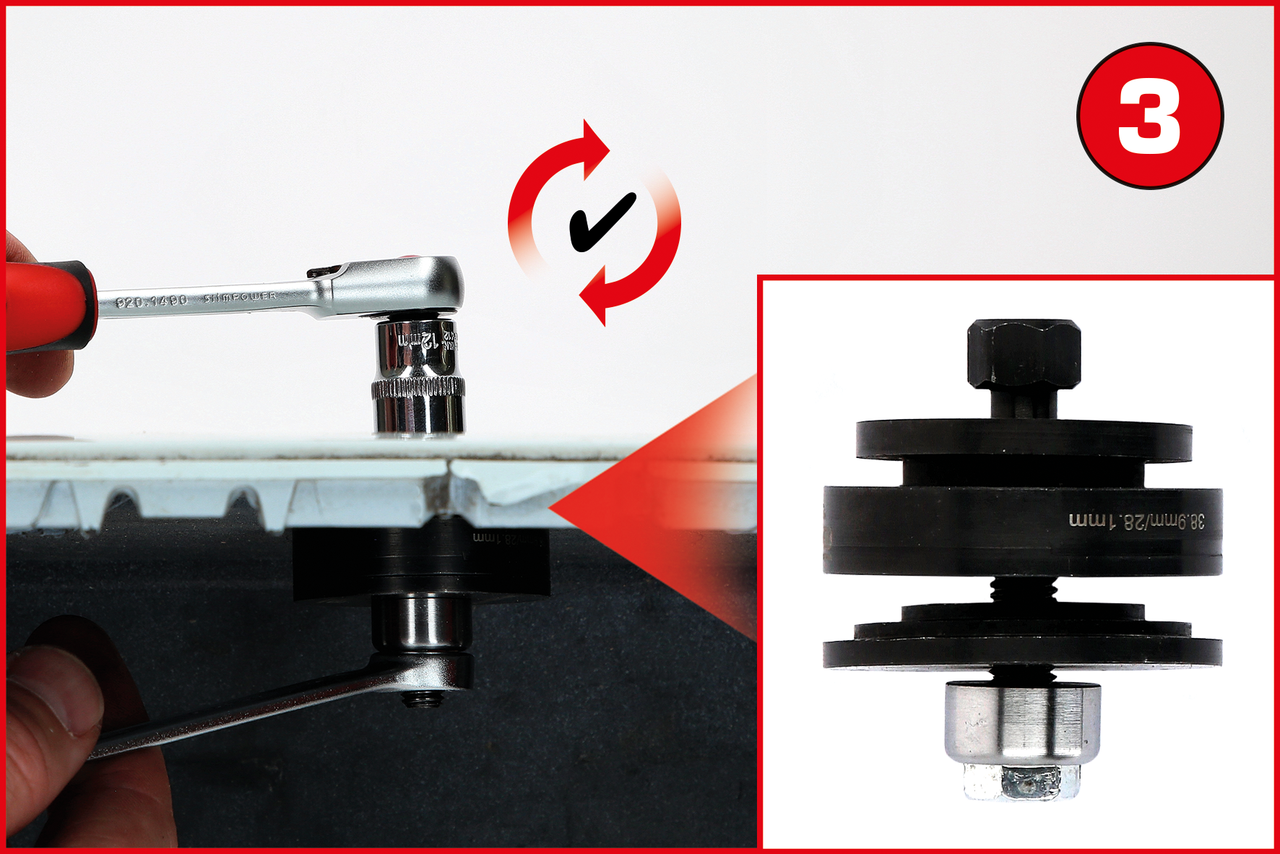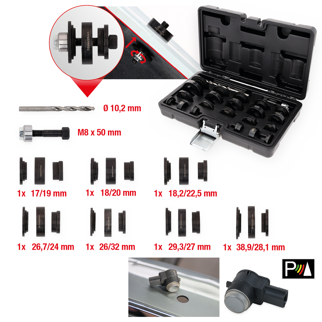 Dank der verschiedenen Lochstanzen in diversen Größen von 17 mm - 38,9 mm ist der Satz für über 98 % aller Fahrzeugtypen geeignet. Die besondere Konstruktion ermöglicht ein millimetergenaues Einsetzen der empfindlichen Sensoren, was essenziell für deren fehlerfreie Funktion ist.