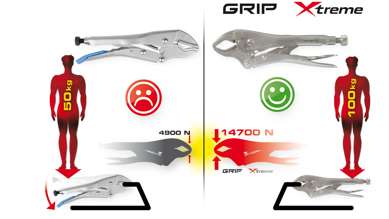 Damit dient sie in vielen Fällen auch schon mal als dritte Hand. Weil sie durch ihren festen Grip nicht abrutscht, werden Verletzungen oder Beschädigungen vermieden. Das sorgt für mehr Sicherheit am Arbeitsplatz. Die Beißkraft einer herkömmlichen Gripzange liegt bei circa 4900 N und wird von der neuen GRIP Xtreme mit 14700 N sogar um ungefähr das Dreifache übertroffen. So haben Versuche gezeigt, dass die einmal angespannte Zange eine 150 kg schweren Person hält, ohne zu verrutschen. Damit ist GRIP Xtreme ein echter Problemlöser.