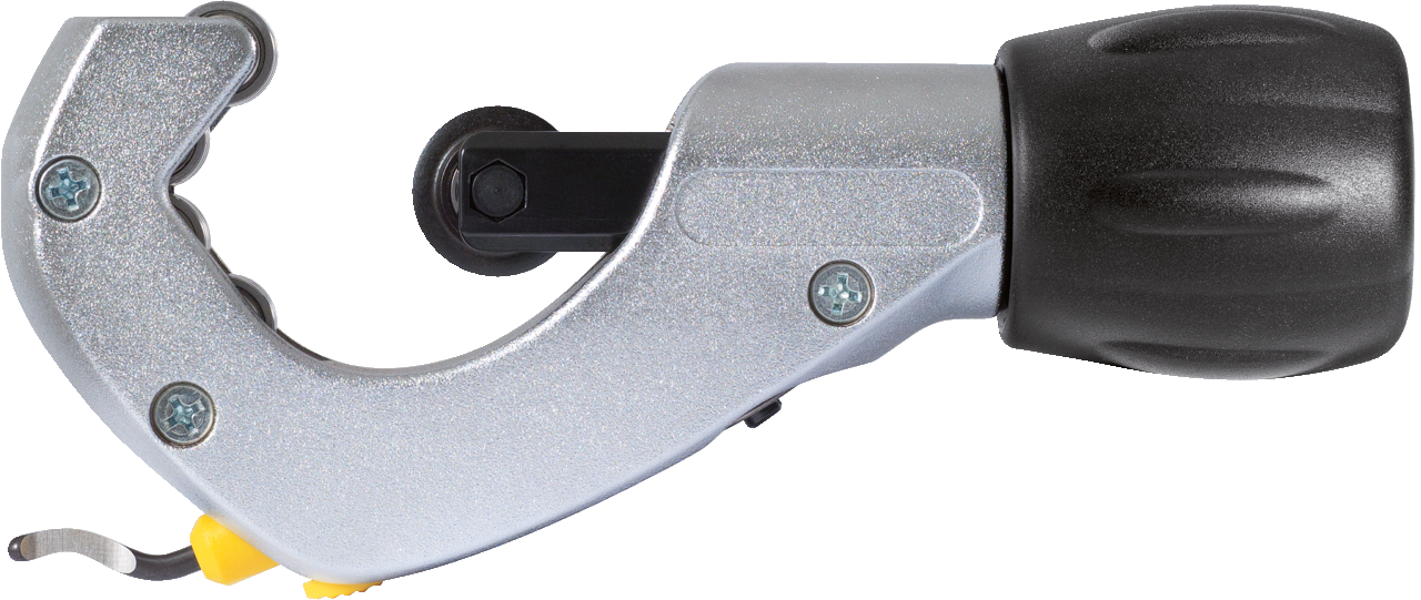 Das Werkzeug hat einen ergonomisch gestalteten handlichen Drehgriff aus Metall für leichtes Arbeiten und lange Lebensdauer. Gleichzeitig sichert ein speziell gehärtetes Schneidrad aus bewährtem, zähhartem Schneidbackenstahl eine lange Standzeit. Weitere Besonderheit: das Schneidrad ist vor der Berührung mit den Gegendruckrollen geschützt, weil die Zustellbewegung begrenzt ist.